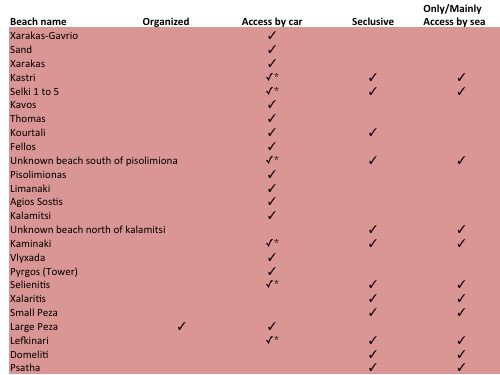 * : the drive is rather difficult and/or requires some walking/hiking in uneven grounds. Most beaches with a * would be easier to be accessed by sea than a car.