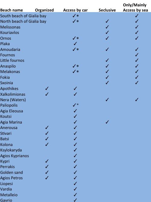 * : the drive is rather difficult and/or requires some walking/hiking in uneven grounds. Most beaches with a * would be easier to be accessed by sea than a car.